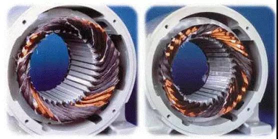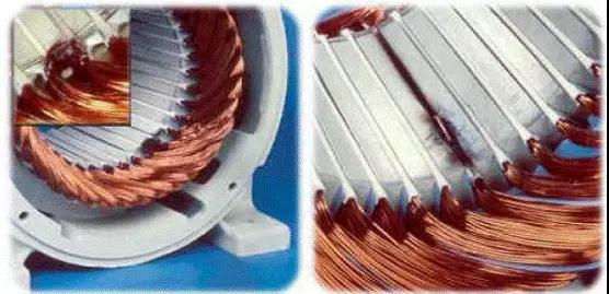 上图为4极电机缺相烧坏图片,电机线圈对称烧坏就是缺相烧坏,星形接法缺相烧的话,2极电机只有2组线圈是好的,4极电机对称烧只有4组线圈是好;三角形连接缺相烧的话,2极电机对称烧2组线圈,4极电机对称烧4组线圈。