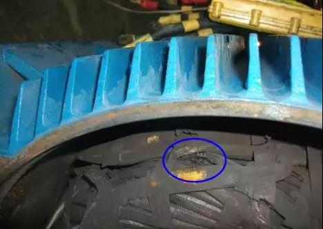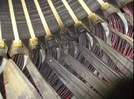 绕组全部变黑色,端部扎带变色并且变脆甚至断裂。