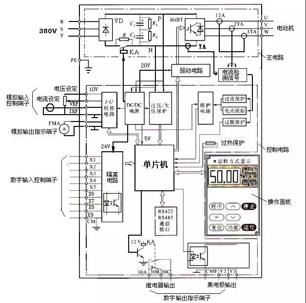 这是一张比较通用的低压变频器的功能框图,它将变频器的基本功能都表现在功能框图上。小编也将沿着框图的思路来给大家介绍。