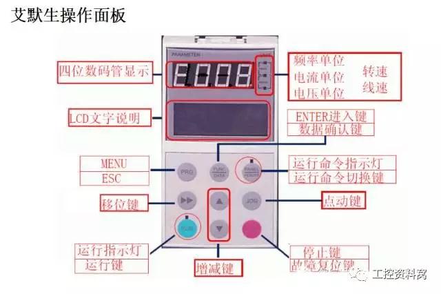 变频器操作面板是最重要的人机操作界面,它不仅能够实现参数的输入功能,还能实现频率、电流、转速、线速度、输出功率、输出转矩、端子状态、闭环参数、长度等物理量的监控,以及对这些物理量进行存储与修改。通过变频器的故障报警显示,对上述物理量进行适当修改,排除变频器的有关故障。下图所示为三菱和艾默生变频器的操作面板。