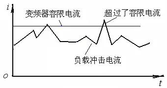 变频器过电流跳闸较频繁,电动机的转速又较低时,可以考虑增加一级减速器,利用提高转速的方法减小电动机电流。如果没法增加减速器,就要考虑更换高一级功率档次的变频器。该种跳闸的根源是变频器的容量选的小,满足不了冲击负载的要求,如下图所示。