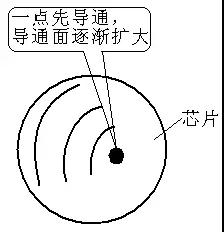 短路过电流时电流的陡度di/dt很大,而开关器件的导通规律是先一点导通,逐渐向整个导通面扩大(如下图所示)。因突然很大的短路电流会造成热量集中,在保护电路还来不及保护时导通点已经过热击穿损坏。所以负载短路造成开关模块损坏的概率非常高。