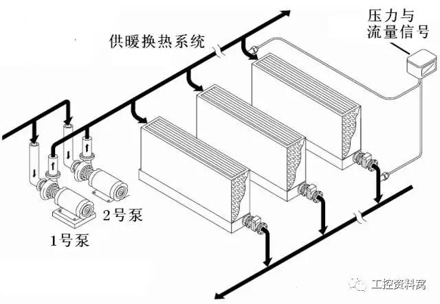 某用户用一台西门子MM440系列22KW变频器来控制纺织车间集中供热换热系统(如图所示),在停机加泵时总是出现F001过流故障。