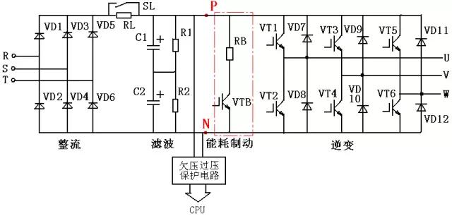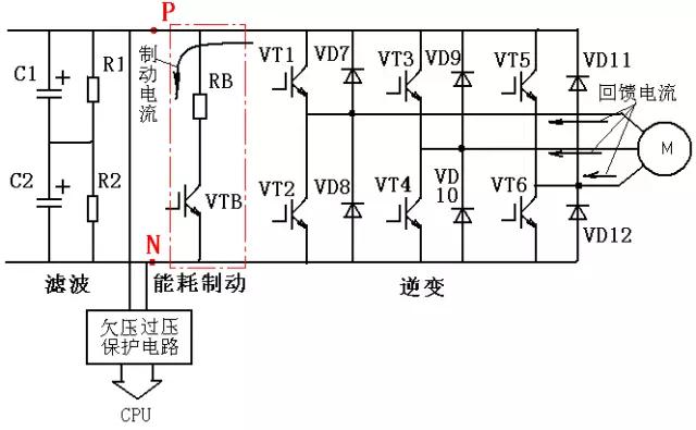 电能回馈如下图所示,电动机发出的三相交流电通过二极管VD7VD12整流,加在直流母线上,使直流母线电压升高,当直流母线电压上升到760V以上,制动单元VTB导通,回馈电流通过制动电阻RB放电,将回馈电能消耗掉。因为电动机产生的回馈电能被制动电阻所消耗,电动机得到制动力矩而制动。